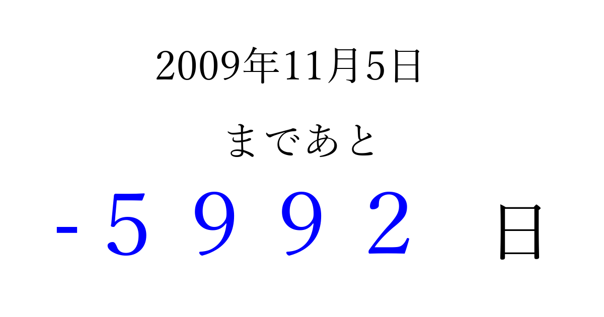 2009年11月5日(木)は もう 0000 日過ぎました 追加すると、トップページからすぐ選べるようになります ※2026/04/02現在の結果です。 最新の状態に更新する ↓シェアして、タイムライン上にカウントダウンを表示しよう!↓ 📤 この結果を共有する Tweet シェア Threads Bluesky 別の日付でカウントダウン 2009年11月のカレンダー このページをブックマークに追加すると、いつでもカウントダウンを確認できます。 (PC: Ctrl+D / Mac: ⌘+D) hitome-notes.comでは以下のページも運営しています。 指定日と期間から日付を計算 | ガチャ確率計算・シミュレーション | プライバシー・ポリシー 運営者:Avocado