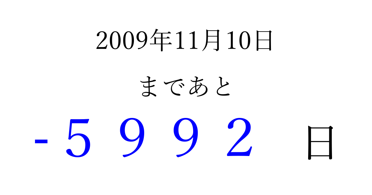 2009年11月10日(火)は もう 0000 日過ぎました 追加すると、トップページからすぐ選べるようになります ※2026/04/07現在の結果です。 最新の状態に更新する ↓シェアして、タイムライン上にカウントダウンを表示しよう!↓ 📤 この結果を共有する Tweet シェア Threads Bluesky 別の日付でカウントダウン 2009年11月のカレンダー このページをブックマークに追加すると、いつでもカウントダウンを確認できます。 (PC: Ctrl+D / Mac: ⌘+D) hitome-notes.comでは以下のページも運営しています。 指定日と期間から日付を計算 | ガチャ確率計算・シミュレーション | プライバシー・ポリシー 運営者:Avocado