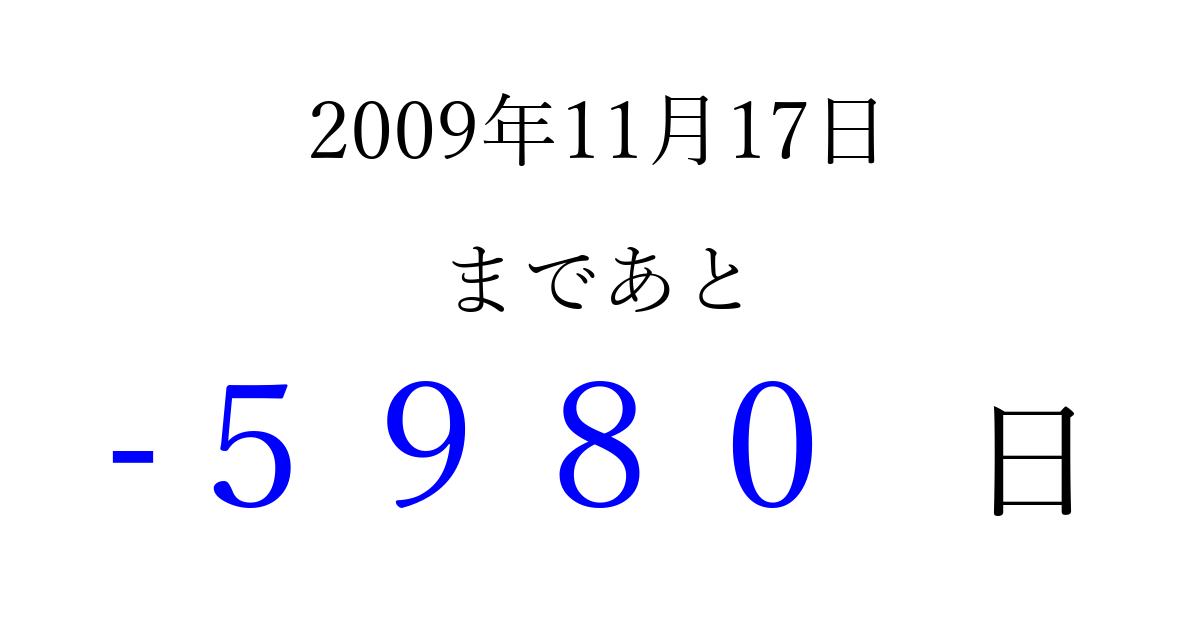 2009年11月17日(火)は もう 0000 日過ぎました 追加すると、トップページからすぐ選べるようになります ※2026/04/02現在の結果です。 最新の状態に更新する ↓シェアして、タイムライン上にカウントダウンを表示しよう!↓ 📤 この結果を共有する Tweet シェア Threads Bluesky 別の日付でカウントダウン 2009年11月のカレンダー このページをブックマークに追加すると、いつでもカウントダウンを確認できます。 (PC: Ctrl+D / Mac: ⌘+D) hitome-notes.comでは以下のページも運営しています。 指定日と期間から日付を計算 | ガチャ確率計算・シミュレーション | プライバシー・ポリシー 運営者:Avocado