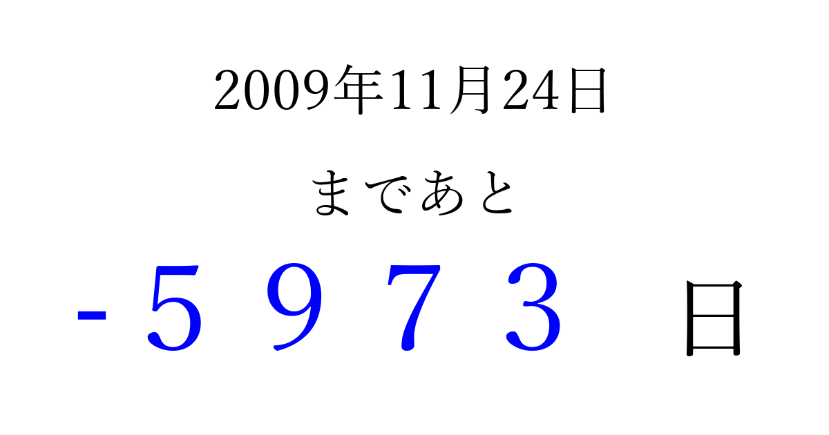 2009年11月24日(火)は もう 0000 日過ぎました 追加すると、トップページからすぐ選べるようになります ※2026/04/02現在の結果です。 最新の状態に更新する ↓シェアして、タイムライン上にカウントダウンを表示しよう!↓ 📤 この結果を共有する Tweet シェア Threads Bluesky 別の日付でカウントダウン 2009年11月のカレンダー このページをブックマークに追加すると、いつでもカウントダウンを確認できます。 (PC: Ctrl+D / Mac: ⌘+D) hitome-notes.comでは以下のページも運営しています。 指定日と期間から日付を計算 | ガチャ確率計算・シミュレーション | プライバシー・ポリシー 運営者:Avocado