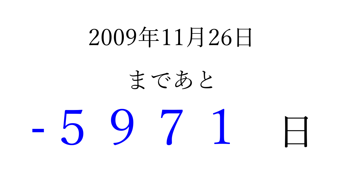 2009年11月26日(木)は もう 0000 日過ぎました 追加すると、トップページからすぐ選べるようになります ※2026/04/02現在の結果です。 最新の状態に更新する ↓シェアして、タイムライン上にカウントダウンを表示しよう!↓ 📤 この結果を共有する Tweet シェア Threads Bluesky 別の日付でカウントダウン 2009年11月のカレンダー このページをブックマークに追加すると、いつでもカウントダウンを確認できます。 (PC: Ctrl+D / Mac: ⌘+D) hitome-notes.comでは以下のページも運営しています。 指定日と期間から日付を計算 | ガチャ確率計算・シミュレーション | プライバシー・ポリシー 運営者:Avocado