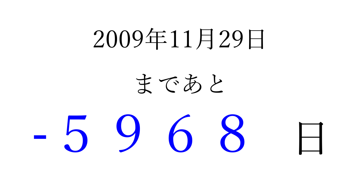 2009年11月29日(日)は もう 0000 日過ぎました 追加すると、トップページからすぐ選べるようになります ※2026/04/02現在の結果です。 最新の状態に更新する ↓シェアして、タイムライン上にカウントダウンを表示しよう!↓ 📤 この結果を共有する Tweet シェア Threads Bluesky 別の日付でカウントダウン 2009年11月のカレンダー このページをブックマークに追加すると、いつでもカウントダウンを確認できます。 (PC: Ctrl+D / Mac: ⌘+D) hitome-notes.comでは以下のページも運営しています。 指定日と期間から日付を計算 | ガチャ確率計算・シミュレーション | プライバシー・ポリシー 運営者:Avocado