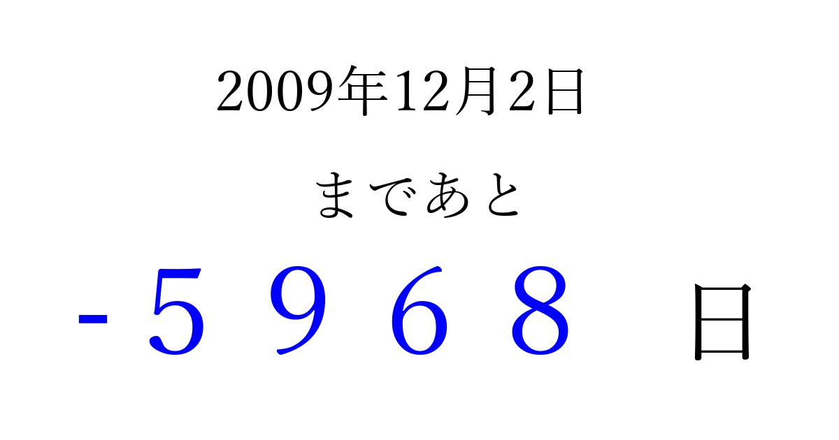 2009年12月2日(水)は もう 0000 日過ぎました 追加すると、トップページからすぐ選べるようになります ※2026/04/05現在の結果です。 最新の状態に更新する ↓シェアして、タイムライン上にカウントダウンを表示しよう!↓ 📤 この結果を共有する Tweet シェア Threads Bluesky 別の日付でカウントダウン 2009年12月のカレンダー このページをブックマークに追加すると、いつでもカウントダウンを確認できます。 (PC: Ctrl+D / Mac: ⌘+D) hitome-notes.comでは以下のページも運営しています。 指定日と期間から日付を計算 | ガチャ確率計算・シミュレーション | プライバシー・ポリシー 運営者:Avocado