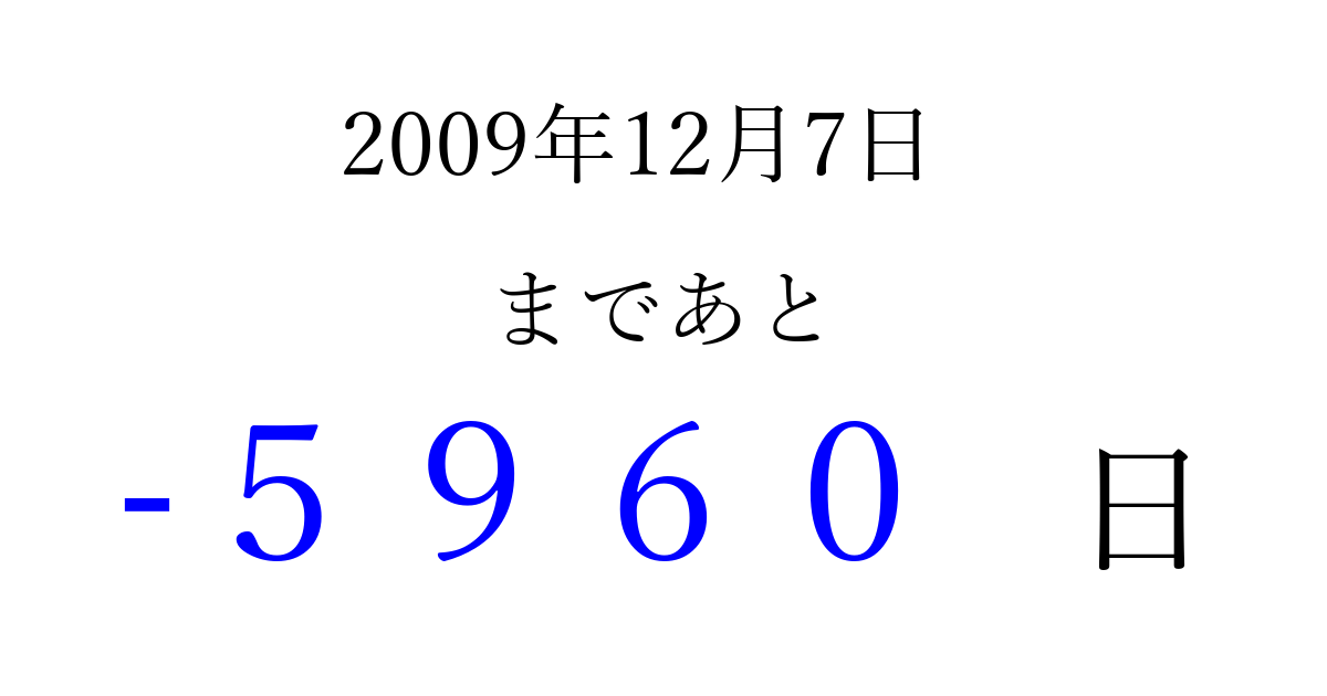 2009年12月7日(月)は もう 0000 日過ぎました 追加すると、トップページからすぐ選べるようになります ※2026/04/02現在の結果です。 最新の状態に更新する ↓シェアして、タイムライン上にカウントダウンを表示しよう!↓ 📤 この結果を共有する Tweet シェア Threads Bluesky 別の日付でカウントダウン 2009年12月のカレンダー このページをブックマークに追加すると、いつでもカウントダウンを確認できます。 (PC: Ctrl+D / Mac: ⌘+D) hitome-notes.comでは以下のページも運営しています。 指定日と期間から日付を計算 | ガチャ確率計算・シミュレーション | プライバシー・ポリシー 運営者:Avocado