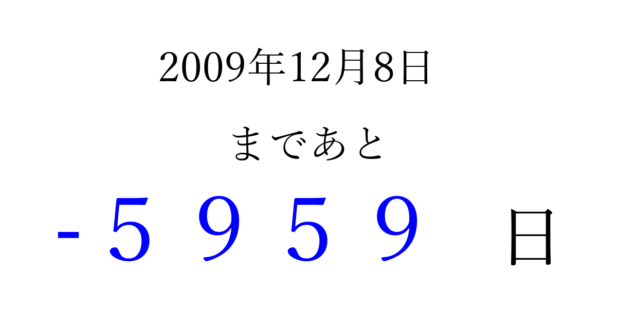 2009年12月8日(火)は もう 0000 日過ぎました 追加すると、トップページからすぐ選べるようになります ※2026/04/02現在の結果です。 最新の状態に更新する ↓シェアして、タイムライン上にカウントダウンを表示しよう!↓ 📤 この結果を共有する Tweet シェア Threads Bluesky 別の日付でカウントダウン 2009年12月のカレンダー このページをブックマークに追加すると、いつでもカウントダウンを確認できます。 (PC: Ctrl+D / Mac: ⌘+D) hitome-notes.comでは以下のページも運営しています。 指定日と期間から日付を計算 | ガチャ確率計算・シミュレーション | プライバシー・ポリシー 運営者:Avocado