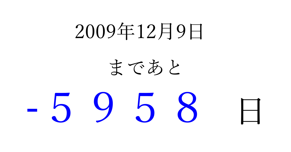 2009年12月9日(水)は もう 0000 日過ぎました 追加すると、トップページからすぐ選べるようになります ※2026/04/02現在の結果です。 最新の状態に更新する ↓シェアして、タイムライン上にカウントダウンを表示しよう!↓ 📤 この結果を共有する Tweet シェア Threads Bluesky 別の日付でカウントダウン 2009年12月のカレンダー このページをブックマークに追加すると、いつでもカウントダウンを確認できます。 (PC: Ctrl+D / Mac: ⌘+D) hitome-notes.comでは以下のページも運営しています。 指定日と期間から日付を計算 | ガチャ確率計算・シミュレーション | プライバシー・ポリシー 運営者:Avocado
