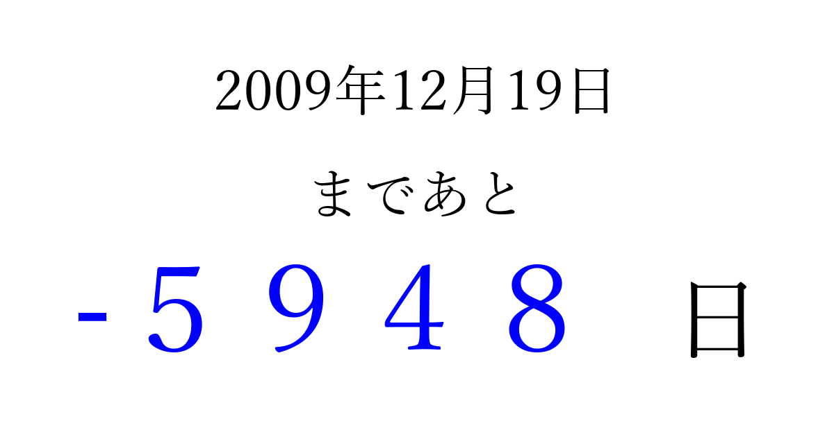 2009年12月19日(土)は もう 0000 日過ぎました 追加すると、トップページからすぐ選べるようになります ※2026/04/02現在の結果です。 最新の状態に更新する ↓シェアして、タイムライン上にカウントダウンを表示しよう!↓ 📤 この結果を共有する Tweet シェア Threads Bluesky 別の日付でカウントダウン 2009年12月のカレンダー このページをブックマークに追加すると、いつでもカウントダウンを確認できます。 (PC: Ctrl+D / Mac: ⌘+D) hitome-notes.comでは以下のページも運営しています。 指定日と期間から日付を計算 | ガチャ確率計算・シミュレーション | プライバシー・ポリシー 運営者:Avocado