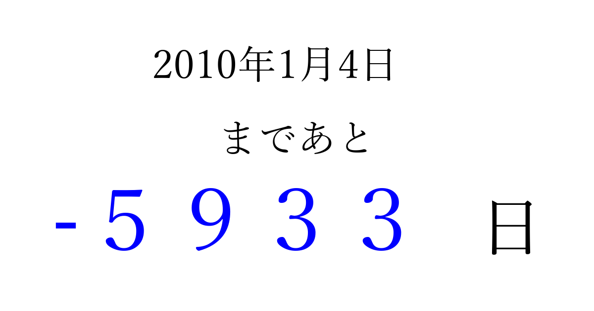 2010年1月4日(月)は もう 0000 日過ぎました 追加すると、トップページからすぐ選べるようになります ※2026/04/03現在の結果です。 最新の状態に更新する ↓シェアして、タイムライン上にカウントダウンを表示しよう!↓ 📤 この結果を共有する Tweet シェア Threads Bluesky 別の日付でカウントダウン 2010年1月のカレンダー このページをブックマークに追加すると、いつでもカウントダウンを確認できます。 (PC: Ctrl+D / Mac: ⌘+D) hitome-notes.comでは以下のページも運営しています。 指定日と期間から日付を計算 | ガチャ確率計算・シミュレーション | プライバシー・ポリシー 運営者:Avocado