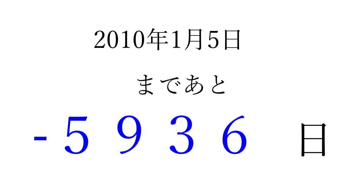 2010年1月5日(火)は もう 0000 日過ぎました 追加すると、トップページからすぐ選べるようになります ※2026/04/07現在の結果です。 最新の状態に更新する ↓シェアして、タイムライン上にカウントダウンを表示しよう!↓ 📤 この結果を共有する Tweet シェア Threads Bluesky 別の日付でカウントダウン 2010年1月のカレンダー このページをブックマークに追加すると、いつでもカウントダウンを確認できます。 (PC: Ctrl+D / Mac: ⌘+D) hitome-notes.comでは以下のページも運営しています。 指定日と期間から日付を計算 | ガチャ確率計算・シミュレーション | プライバシー・ポリシー 運営者:Avocado