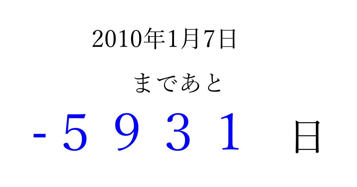 2010年1月7日(木)は もう 0000 日過ぎました 追加すると、トップページからすぐ選べるようになります ※2026/04/04現在の結果です。 最新の状態に更新する ↓シェアして、タイムライン上にカウントダウンを表示しよう!↓ 📤 この結果を共有する Tweet シェア Threads Bluesky 別の日付でカウントダウン 2010年1月のカレンダー このページをブックマークに追加すると、いつでもカウントダウンを確認できます。 (PC: Ctrl+D / Mac: ⌘+D) hitome-notes.comでは以下のページも運営しています。 指定日と期間から日付を計算 | ガチャ確率計算・シミュレーション | プライバシー・ポリシー 運営者:Avocado