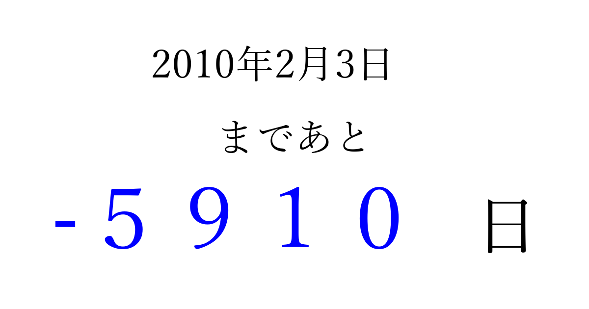 2010年2月3日(水)は もう 0000 日過ぎました 追加すると、トップページからすぐ選べるようになります ※2026/04/10現在の結果です。 最新の状態に更新する ↓シェアして、タイムライン上にカウントダウンを表示しよう!↓ 📤 この結果を共有する Tweet シェア Threads Bluesky 別の日付でカウントダウン 2010年2月のカレンダー このページをブックマークに追加すると、いつでもカウントダウンを確認できます。 (PC: Ctrl+D / Mac: ⌘+D) hitome-notes.comでは以下のページも運営しています。 指定日と期間から日付を計算 | ガチャ確率計算・シミュレーション | プライバシー・ポリシー 運営者:Avocado
