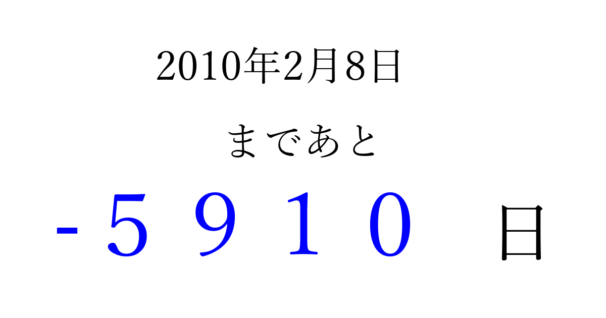 2010年2月8日(月)は もう 0000 日過ぎました 追加すると、トップページからすぐ選べるようになります ※2026/04/15現在の結果です。 最新の状態に更新する ↓シェアして、タイムライン上にカウントダウンを表示しよう!↓ 📤 この結果を共有する Tweet シェア Threads Bluesky 別の日付でカウントダウン 2010年2月のカレンダー このページをブックマークに追加すると、いつでもカウントダウンを確認できます。 (PC: Ctrl+D / Mac: ⌘+D) hitome-notes.comでは以下のページも運営しています。 指定日と期間から日付を計算 | ガチャ確率計算・シミュレーション | プライバシー・ポリシー 運営者:Avocado