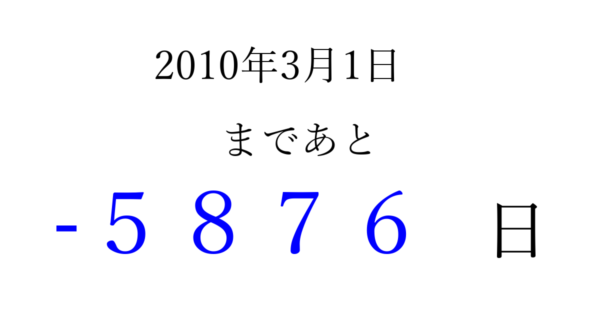 2010年3月1日(月)は もう 0000 日過ぎました 追加すると、トップページからすぐ選べるようになります ※2026/04/02現在の結果です。 最新の状態に更新する ↓シェアして、タイムライン上にカウントダウンを表示しよう!↓ 📤 この結果を共有する Tweet シェア Threads Bluesky 別の日付でカウントダウン 2010年3月のカレンダー このページをブックマークに追加すると、いつでもカウントダウンを確認できます。 (PC: Ctrl+D / Mac: ⌘+D) hitome-notes.comでは以下のページも運営しています。 指定日と期間から日付を計算 | ガチャ確率計算・シミュレーション | プライバシー・ポリシー 運営者:Avocado