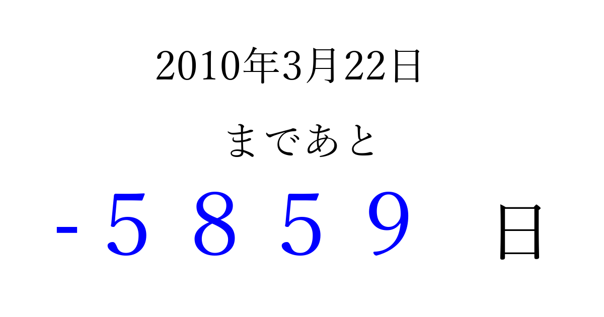 2010年3月22日(月)は もう 0000 日過ぎました 追加すると、トップページからすぐ選べるようになります ※2026/04/06現在の結果です。 最新の状態に更新する ↓シェアして、タイムライン上にカウントダウンを表示しよう!↓ 📤 この結果を共有する Tweet シェア Threads Bluesky 別の日付でカウントダウン 2010年3月のカレンダー このページをブックマークに追加すると、いつでもカウントダウンを確認できます。 (PC: Ctrl+D / Mac: ⌘+D) hitome-notes.comでは以下のページも運営しています。 指定日と期間から日付を計算 | ガチャ確率計算・シミュレーション | プライバシー・ポリシー 運営者:Avocado