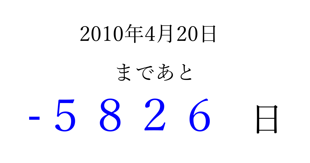 2010年4月20日(火)は もう 0000 日過ぎました 追加すると、トップページからすぐ選べるようになります ※2026/04/02現在の結果です。 最新の状態に更新する ↓シェアして、タイムライン上にカウントダウンを表示しよう!↓ 📤 この結果を共有する Tweet シェア Threads Bluesky 別の日付でカウントダウン 2010年4月のカレンダー このページをブックマークに追加すると、いつでもカウントダウンを確認できます。 (PC: Ctrl+D / Mac: ⌘+D) hitome-notes.comでは以下のページも運営しています。 指定日と期間から日付を計算 | ガチャ確率計算・シミュレーション | プライバシー・ポリシー 運営者:Avocado