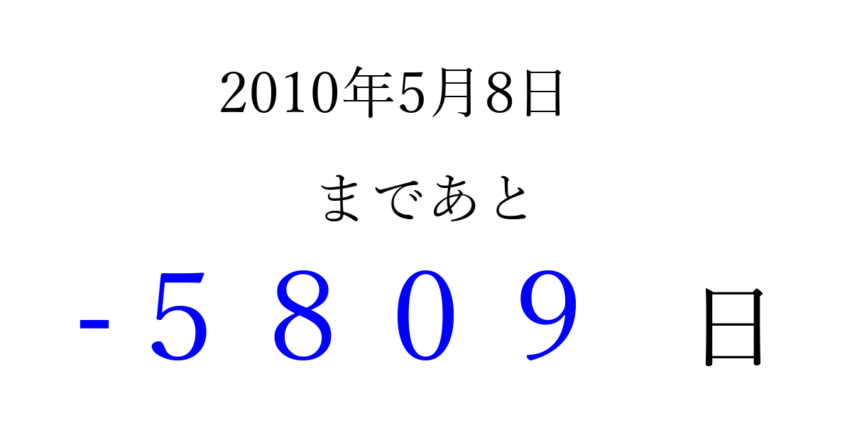 2010年5月8日(土)は もう 0000 日過ぎました 追加すると、トップページからすぐ選べるようになります ※2026/04/03現在の結果です。 最新の状態に更新する ↓シェアして、タイムライン上にカウントダウンを表示しよう!↓ 📤 この結果を共有する Tweet シェア Threads Bluesky 別の日付でカウントダウン 2010年5月のカレンダー このページをブックマークに追加すると、いつでもカウントダウンを確認できます。 (PC: Ctrl+D / Mac: ⌘+D) hitome-notes.comでは以下のページも運営しています。 指定日と期間から日付を計算 | ガチャ確率計算・シミュレーション | プライバシー・ポリシー 運営者:Avocado