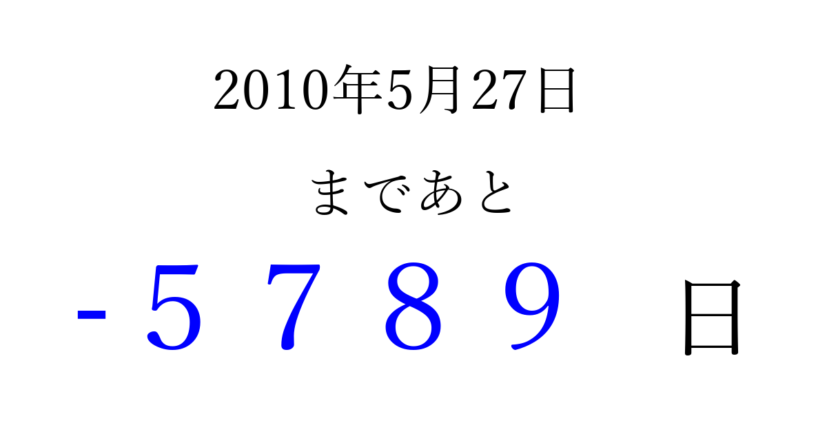 2010年5月27日(木)は もう 0000 日過ぎました 追加すると、トップページからすぐ選べるようになります ※2026/04/02現在の結果です。 最新の状態に更新する ↓シェアして、タイムライン上にカウントダウンを表示しよう!↓ 📤 この結果を共有する Tweet シェア Threads Bluesky 別の日付でカウントダウン 2010年5月のカレンダー このページをブックマークに追加すると、いつでもカウントダウンを確認できます。 (PC: Ctrl+D / Mac: ⌘+D) hitome-notes.comでは以下のページも運営しています。 指定日と期間から日付を計算 | ガチャ確率計算・シミュレーション | プライバシー・ポリシー 運営者:Avocado
