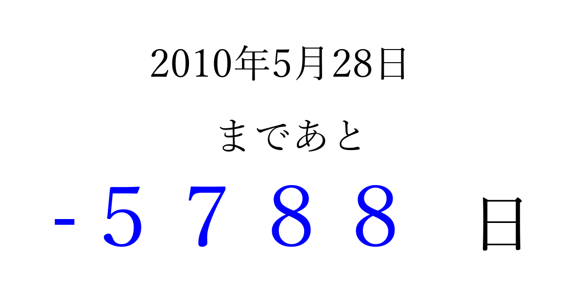 2010年5月28日(金)は もう 0000 日過ぎました 追加すると、トップページからすぐ選べるようになります ※2026/04/02現在の結果です。 最新の状態に更新する ↓シェアして、タイムライン上にカウントダウンを表示しよう!↓ 📤 この結果を共有する Tweet シェア Threads Bluesky 別の日付でカウントダウン 2010年5月のカレンダー このページをブックマークに追加すると、いつでもカウントダウンを確認できます。 (PC: Ctrl+D / Mac: ⌘+D) hitome-notes.comでは以下のページも運営しています。 指定日と期間から日付を計算 | ガチャ確率計算・シミュレーション | プライバシー・ポリシー 運営者:Avocado