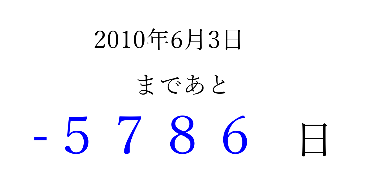 2010年6月3日(木)は もう 0000 日過ぎました 追加すると、トップページからすぐ選べるようになります ※2026/04/06現在の結果です。 最新の状態に更新する ↓シェアして、タイムライン上にカウントダウンを表示しよう!↓ 📤 この結果を共有する Tweet シェア Threads Bluesky 別の日付でカウントダウン 2010年6月のカレンダー このページをブックマークに追加すると、いつでもカウントダウンを確認できます。 (PC: Ctrl+D / Mac: ⌘+D) hitome-notes.comでは以下のページも運営しています。 指定日と期間から日付を計算 | ガチャ確率計算・シミュレーション | プライバシー・ポリシー 運営者:Avocado
