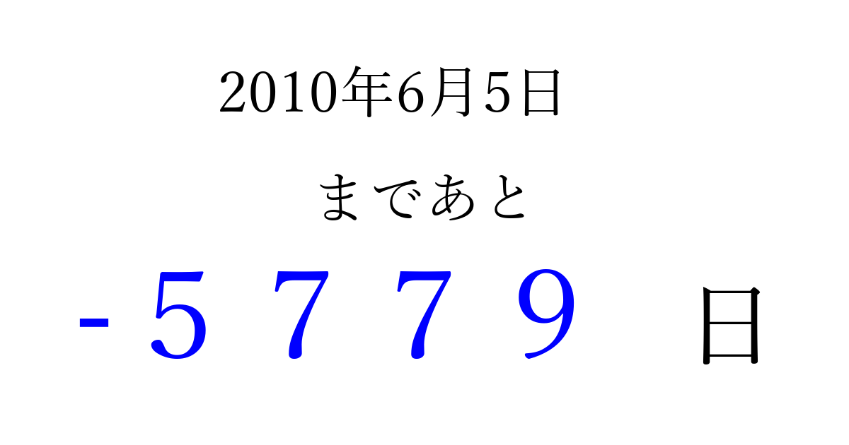 2010年6月5日(土)は もう 0000 日過ぎました 追加すると、トップページからすぐ選べるようになります ※2026/04/01現在の結果です。 最新の状態に更新する ↓シェアして、タイムライン上にカウントダウンを表示しよう!↓ 📤 この結果を共有する Tweet シェア Threads Bluesky 別の日付でカウントダウン 2010年6月のカレンダー このページをブックマークに追加すると、いつでもカウントダウンを確認できます。 (PC: Ctrl+D / Mac: ⌘+D) hitome-notes.comでは以下のページも運営しています。 指定日と期間から日付を計算 | ガチャ確率計算・シミュレーション | プライバシー・ポリシー 運営者:Avocado