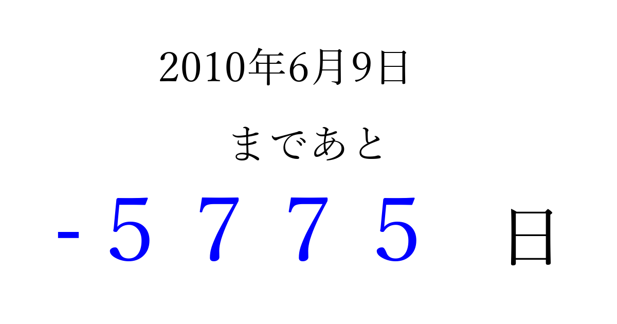 2010年6月9日(水)は もう 0000 日過ぎました 追加すると、トップページからすぐ選べるようになります ※2026/04/01現在の結果です。 最新の状態に更新する ↓シェアして、タイムライン上にカウントダウンを表示しよう!↓ 📤 この結果を共有する Tweet シェア Threads Bluesky 別の日付でカウントダウン 2010年6月のカレンダー このページをブックマークに追加すると、いつでもカウントダウンを確認できます。 (PC: Ctrl+D / Mac: ⌘+D) hitome-notes.comでは以下のページも運営しています。 指定日と期間から日付を計算 | ガチャ確率計算・シミュレーション | プライバシー・ポリシー 運営者:Avocado