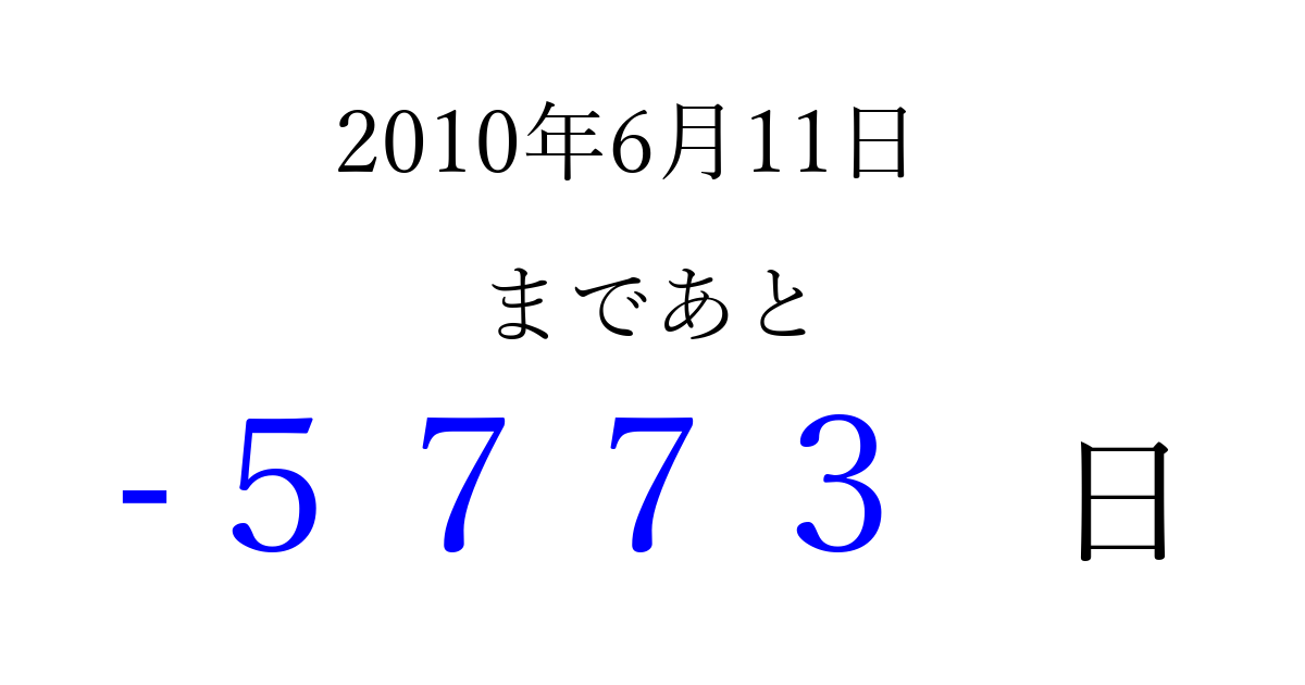 2010年6月11日(金)は もう 0000 日過ぎました 追加すると、トップページからすぐ選べるようになります ※2026/04/01現在の結果です。 最新の状態に更新する ↓シェアして、タイムライン上にカウントダウンを表示しよう!↓ 📤 この結果を共有する Tweet シェア Threads Bluesky 別の日付でカウントダウン 2010年6月のカレンダー このページをブックマークに追加すると、いつでもカウントダウンを確認できます。 (PC: Ctrl+D / Mac: ⌘+D) hitome-notes.comでは以下のページも運営しています。 指定日と期間から日付を計算 | ガチャ確率計算・シミュレーション | プライバシー・ポリシー 運営者:Avocado