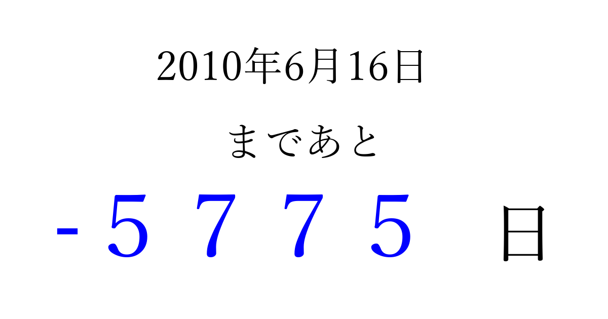2010年6月16日(水)は もう 0000 日過ぎました 追加すると、トップページからすぐ選べるようになります ※2026/04/08現在の結果です。 最新の状態に更新する ↓シェアして、タイムライン上にカウントダウンを表示しよう!↓ 📤 この結果を共有する Tweet シェア Threads Bluesky 別の日付でカウントダウン 2010年6月のカレンダー このページをブックマークに追加すると、いつでもカウントダウンを確認できます。 (PC: Ctrl+D / Mac: ⌘+D) hitome-notes.comでは以下のページも運営しています。 指定日と期間から日付を計算 | ガチャ確率計算・シミュレーション | プライバシー・ポリシー 運営者:Avocado