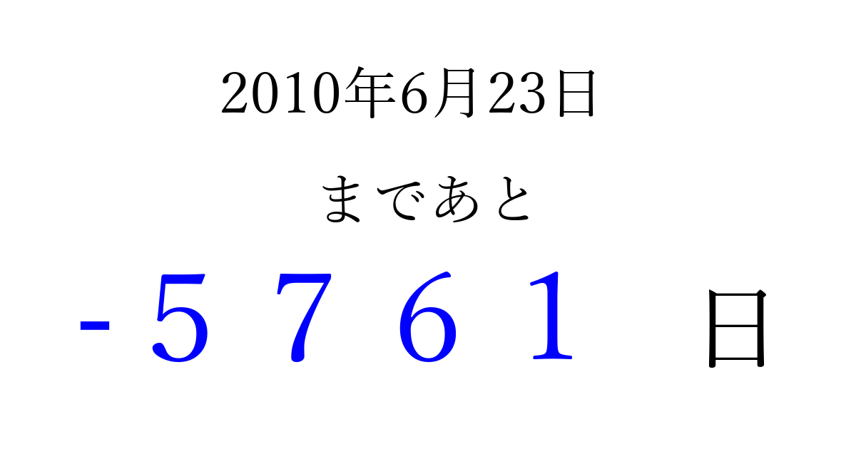 2010年6月23日(水)は もう 0000 日過ぎました 追加すると、トップページからすぐ選べるようになります ※2026/04/01現在の結果です。 最新の状態に更新する ↓シェアして、タイムライン上にカウントダウンを表示しよう!↓ 📤 この結果を共有する Tweet シェア Threads Bluesky 別の日付でカウントダウン 2010年6月のカレンダー このページをブックマークに追加すると、いつでもカウントダウンを確認できます。 (PC: Ctrl+D / Mac: ⌘+D) hitome-notes.comでは以下のページも運営しています。 指定日と期間から日付を計算 | ガチャ確率計算・シミュレーション | プライバシー・ポリシー 運営者:Avocado