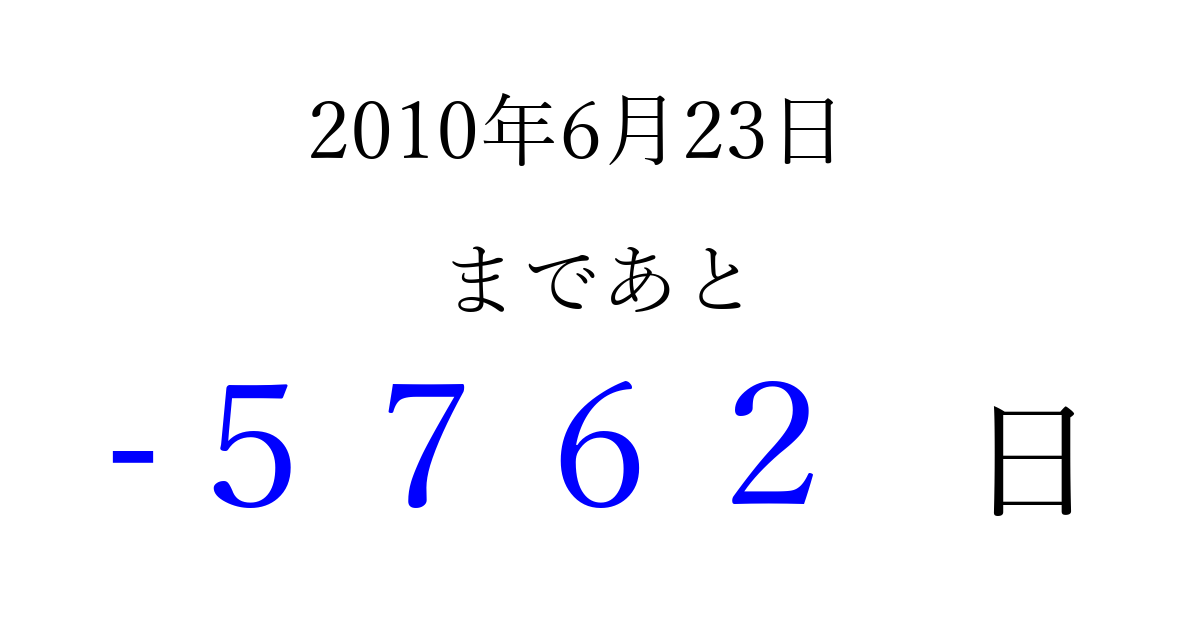 2010年6月23日(水)は もう 0000 日過ぎました 追加すると、トップページからすぐ選べるようになります ※2026/04/02現在の結果です。 最新の状態に更新する ↓シェアして、タイムライン上にカウントダウンを表示しよう!↓ 📤 この結果を共有する Tweet シェア Threads Bluesky 別の日付でカウントダウン 2010年6月のカレンダー このページをブックマークに追加すると、いつでもカウントダウンを確認できます。 (PC: Ctrl+D / Mac: ⌘+D) hitome-notes.comでは以下のページも運営しています。 指定日と期間から日付を計算 | ガチャ確率計算・シミュレーション | プライバシー・ポリシー 運営者:Avocado