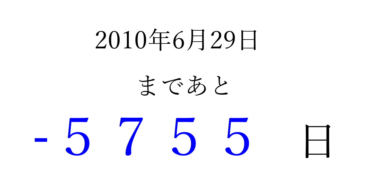 2010年6月29日(火)は もう 0000 日過ぎました 追加すると、トップページからすぐ選べるようになります ※2026/04/01現在の結果です。 最新の状態に更新する ↓シェアして、タイムライン上にカウントダウンを表示しよう!↓ 📤 この結果を共有する Tweet シェア Threads Bluesky 別の日付でカウントダウン 2010年6月のカレンダー このページをブックマークに追加すると、いつでもカウントダウンを確認できます。 (PC: Ctrl+D / Mac: ⌘+D) hitome-notes.comでは以下のページも運営しています。 指定日と期間から日付を計算 | ガチャ確率計算・シミュレーション | プライバシー・ポリシー 運営者:Avocado