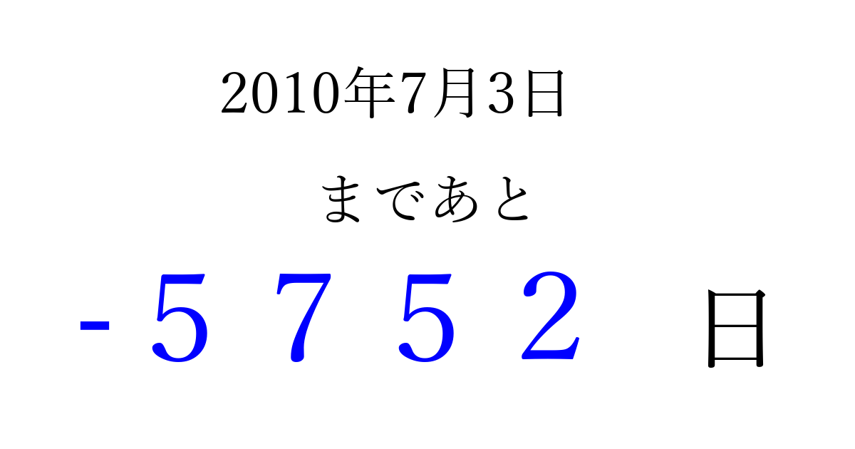 2010年7月3日(土)は もう 0000 日過ぎました 追加すると、トップページからすぐ選べるようになります ※2026/04/02現在の結果です。 最新の状態に更新する ↓シェアして、タイムライン上にカウントダウンを表示しよう!↓ 📤 この結果を共有する Tweet シェア Threads Bluesky 別の日付でカウントダウン 2010年7月のカレンダー このページをブックマークに追加すると、いつでもカウントダウンを確認できます。 (PC: Ctrl+D / Mac: ⌘+D) hitome-notes.comでは以下のページも運営しています。 指定日と期間から日付を計算 | ガチャ確率計算・シミュレーション | プライバシー・ポリシー 運営者:Avocado