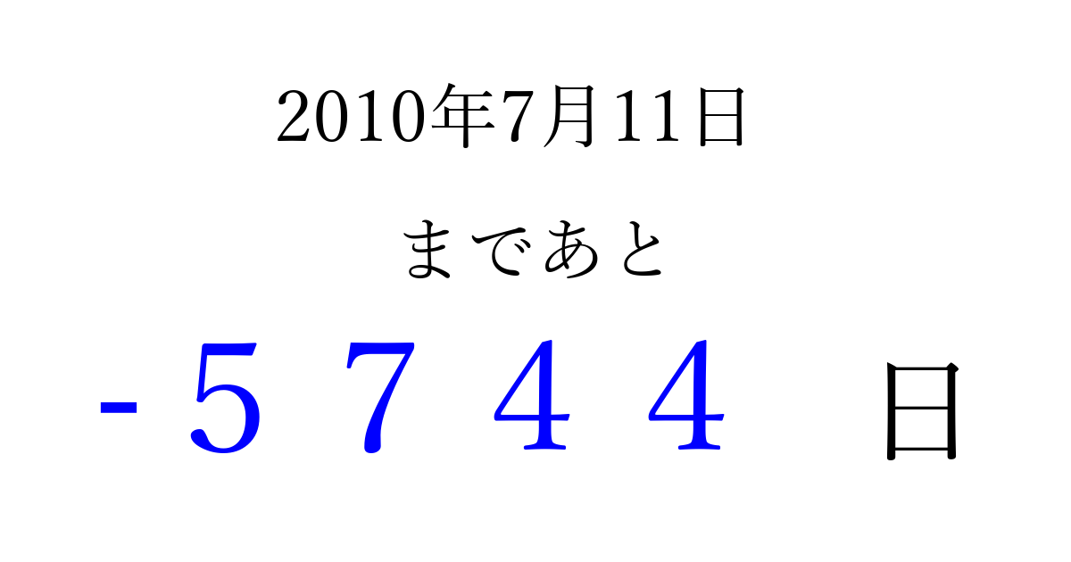 2010年7月11日(日)は もう 0000 日過ぎました 追加すると、トップページからすぐ選べるようになります ※2026/04/02現在の結果です。 最新の状態に更新する ↓シェアして、タイムライン上にカウントダウンを表示しよう!↓ 📤 この結果を共有する Tweet シェア Threads Bluesky 別の日付でカウントダウン 2010年7月のカレンダー このページをブックマークに追加すると、いつでもカウントダウンを確認できます。 (PC: Ctrl+D / Mac: ⌘+D) hitome-notes.comでは以下のページも運営しています。 指定日と期間から日付を計算 | ガチャ確率計算・シミュレーション | プライバシー・ポリシー 運営者:Avocado