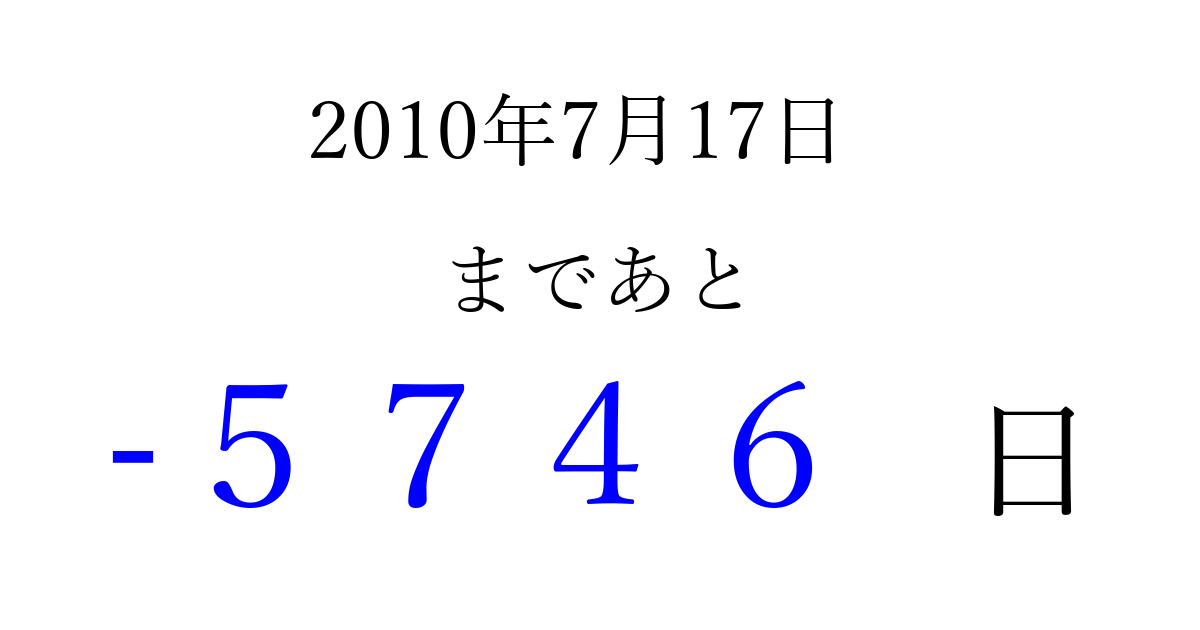 2010年7月17日(土)は もう 0000 日過ぎました 追加すると、トップページからすぐ選べるようになります ※2026/04/10現在の結果です。 最新の状態に更新する ↓シェアして、タイムライン上にカウントダウンを表示しよう!↓ 📤 この結果を共有する Tweet シェア Threads Bluesky 別の日付でカウントダウン 2010年7月のカレンダー このページをブックマークに追加すると、いつでもカウントダウンを確認できます。 (PC: Ctrl+D / Mac: ⌘+D) hitome-notes.comでは以下のページも運営しています。 指定日と期間から日付を計算 | ガチャ確率計算・シミュレーション | プライバシー・ポリシー 運営者:Avocado