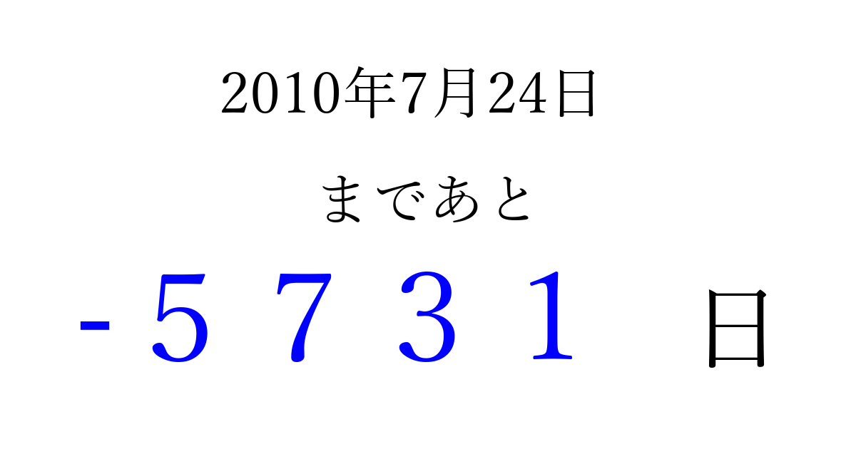 2010年7月24日(土)は もう 0000 日過ぎました 追加すると、トップページからすぐ選べるようになります ※2026/04/02現在の結果です。 最新の状態に更新する ↓シェアして、タイムライン上にカウントダウンを表示しよう!↓ 📤 この結果を共有する Tweet シェア Threads Bluesky 別の日付でカウントダウン 2010年7月のカレンダー このページをブックマークに追加すると、いつでもカウントダウンを確認できます。 (PC: Ctrl+D / Mac: ⌘+D) hitome-notes.comでは以下のページも運営しています。 指定日と期間から日付を計算 | ガチャ確率計算・シミュレーション | プライバシー・ポリシー 運営者:Avocado