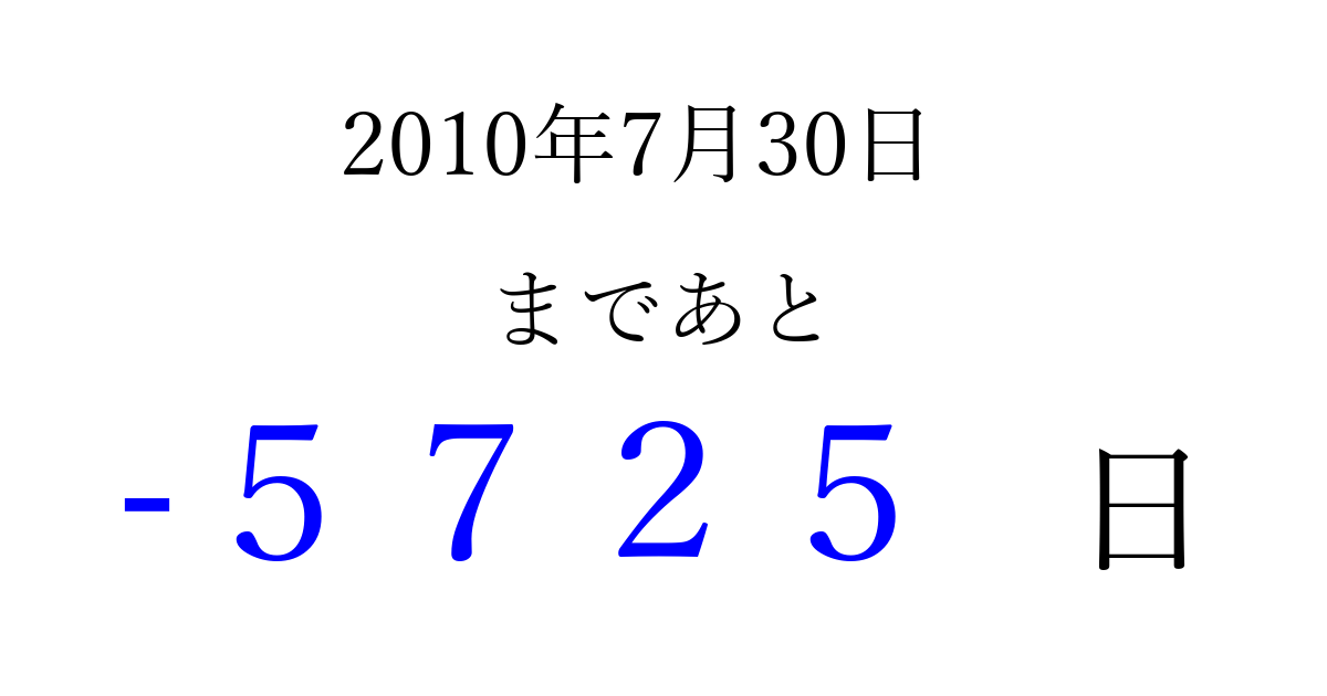 2010年7月30日(金)は もう 0000 日過ぎました 追加すると、トップページからすぐ選べるようになります ※2026/04/02現在の結果です。 最新の状態に更新する ↓シェアして、タイムライン上にカウントダウンを表示しよう!↓ 📤 この結果を共有する Tweet シェア Threads Bluesky 別の日付でカウントダウン 2010年7月のカレンダー このページをブックマークに追加すると、いつでもカウントダウンを確認できます。 (PC: Ctrl+D / Mac: ⌘+D) hitome-notes.comでは以下のページも運営しています。 指定日と期間から日付を計算 | ガチャ確率計算・シミュレーション | プライバシー・ポリシー 運営者:Avocado