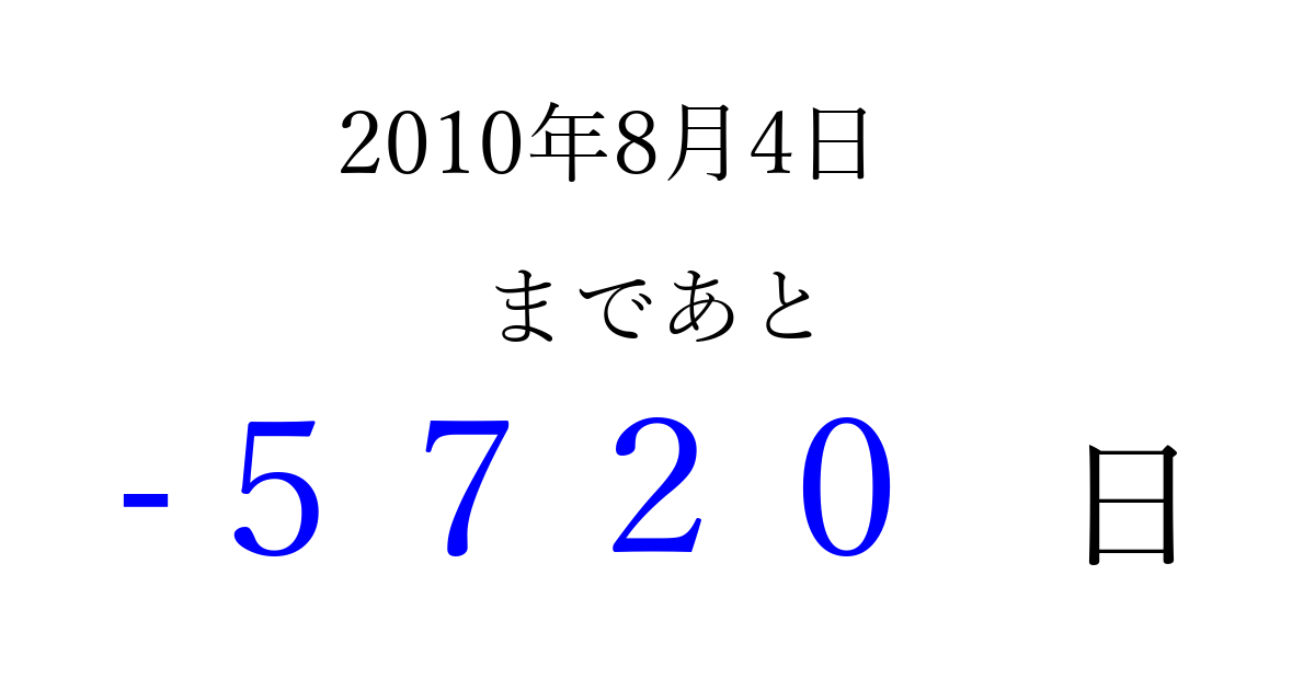 2010年8月4日(水)は もう 0000 日過ぎました 追加すると、トップページからすぐ選べるようになります ※2026/04/02現在の結果です。 最新の状態に更新する ↓シェアして、タイムライン上にカウントダウンを表示しよう!↓ 📤 この結果を共有する Tweet シェア Threads Bluesky 別の日付でカウントダウン 2010年8月のカレンダー このページをブックマークに追加すると、いつでもカウントダウンを確認できます。 (PC: Ctrl+D / Mac: ⌘+D) hitome-notes.comでは以下のページも運営しています。 指定日と期間から日付を計算 | ガチャ確率計算・シミュレーション | プライバシー・ポリシー 運営者:Avocado