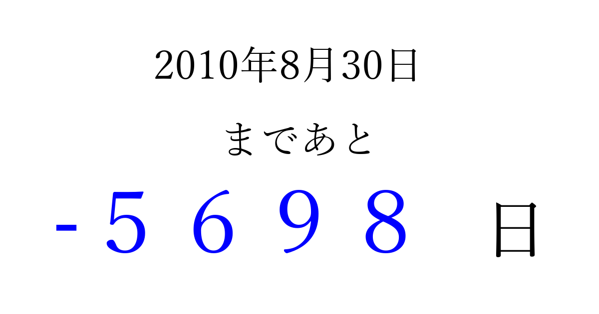 2010年8月30日(月)は もう 0000 日過ぎました 追加すると、トップページからすぐ選べるようになります ※2026/04/06現在の結果です。 最新の状態に更新する ↓シェアして、タイムライン上にカウントダウンを表示しよう!↓ 📤 この結果を共有する Tweet シェア Threads Bluesky 別の日付でカウントダウン 2010年8月のカレンダー このページをブックマークに追加すると、いつでもカウントダウンを確認できます。 (PC: Ctrl+D / Mac: ⌘+D) hitome-notes.comでは以下のページも運営しています。 指定日と期間から日付を計算 | ガチャ確率計算・シミュレーション | プライバシー・ポリシー 運営者:Avocado