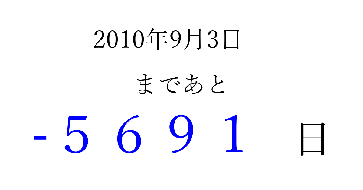 2010年9月3日(金)は もう 0000 日過ぎました 追加すると、トップページからすぐ選べるようになります ※2026/04/03現在の結果です。 最新の状態に更新する ↓シェアして、タイムライン上にカウントダウンを表示しよう!↓ 📤 この結果を共有する Tweet シェア Threads Bluesky 別の日付でカウントダウン 2010年9月のカレンダー このページをブックマークに追加すると、いつでもカウントダウンを確認できます。 (PC: Ctrl+D / Mac: ⌘+D) hitome-notes.comでは以下のページも運営しています。 指定日と期間から日付を計算 | ガチャ確率計算・シミュレーション | プライバシー・ポリシー 運営者:Avocado