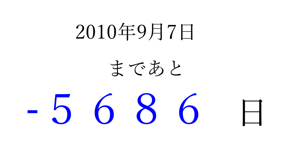 2010年9月7日(火)は もう 0000 日過ぎました 追加すると、トップページからすぐ選べるようになります ※2026/04/02現在の結果です。 最新の状態に更新する ↓シェアして、タイムライン上にカウントダウンを表示しよう!↓ 📤 この結果を共有する Tweet シェア Threads Bluesky 別の日付でカウントダウン 2010年9月のカレンダー このページをブックマークに追加すると、いつでもカウントダウンを確認できます。 (PC: Ctrl+D / Mac: ⌘+D) hitome-notes.comでは以下のページも運営しています。 指定日と期間から日付を計算 | ガチャ確率計算・シミュレーション | プライバシー・ポリシー 運営者:Avocado