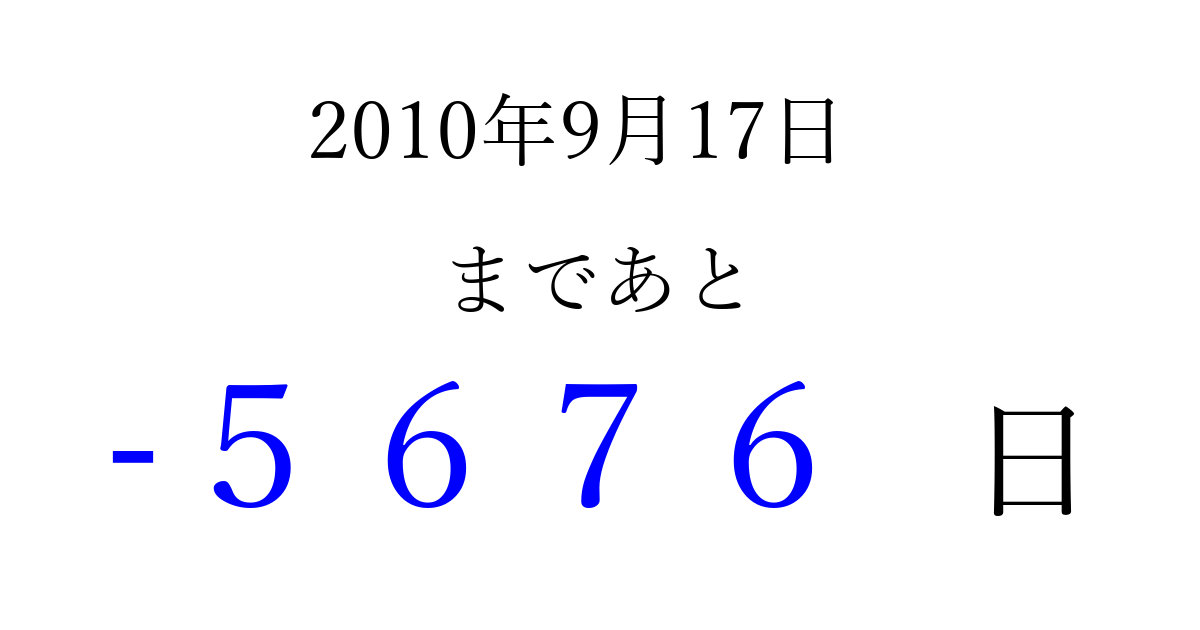 2010年9月17日(金)は もう 0000 日過ぎました 追加すると、トップページからすぐ選べるようになります ※2026/04/02現在の結果です。 最新の状態に更新する ↓シェアして、タイムライン上にカウントダウンを表示しよう!↓ 📤 この結果を共有する Tweet シェア Threads Bluesky 別の日付でカウントダウン 2010年9月のカレンダー このページをブックマークに追加すると、いつでもカウントダウンを確認できます。 (PC: Ctrl+D / Mac: ⌘+D) hitome-notes.comでは以下のページも運営しています。 指定日と期間から日付を計算 | ガチャ確率計算・シミュレーション | プライバシー・ポリシー 運営者:Avocado