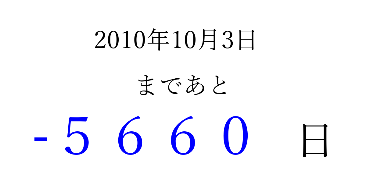2010年10月3日(日)は もう 0000 日過ぎました 追加すると、トップページからすぐ選べるようになります ※2026/04/02現在の結果です。 最新の状態に更新する ↓シェアして、タイムライン上にカウントダウンを表示しよう!↓ 📤 この結果を共有する Tweet シェア Threads Bluesky 別の日付でカウントダウン 2010年10月のカレンダー このページをブックマークに追加すると、いつでもカウントダウンを確認できます。 (PC: Ctrl+D / Mac: ⌘+D) hitome-notes.comでは以下のページも運営しています。 指定日と期間から日付を計算 | ガチャ確率計算・シミュレーション | プライバシー・ポリシー 運営者:Avocado