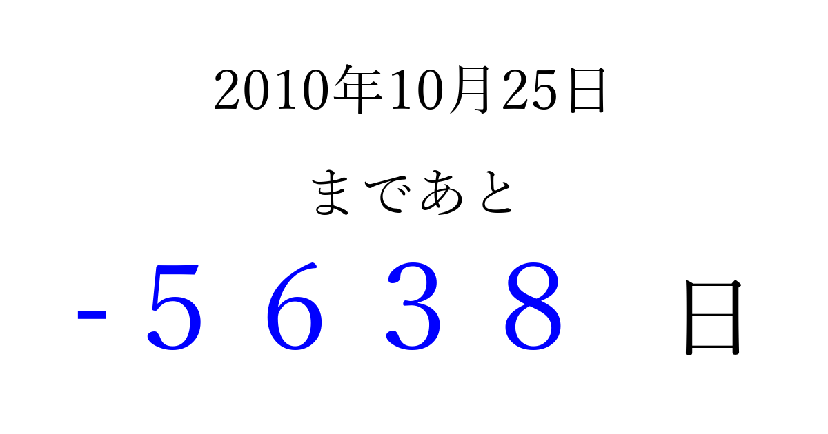 2010年10月25日(月)は もう 0000 日過ぎました 追加すると、トップページからすぐ選べるようになります ※2026/04/02現在の結果です。 最新の状態に更新する ↓シェアして、タイムライン上にカウントダウンを表示しよう!↓ 📤 この結果を共有する Tweet シェア Threads Bluesky 別の日付でカウントダウン 2010年10月のカレンダー このページをブックマークに追加すると、いつでもカウントダウンを確認できます。 (PC: Ctrl+D / Mac: ⌘+D) hitome-notes.comでは以下のページも運営しています。 指定日と期間から日付を計算 | ガチャ確率計算・シミュレーション | プライバシー・ポリシー 運営者:Avocado