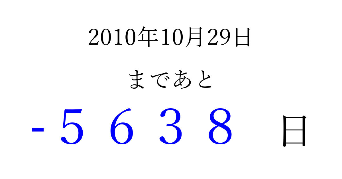 2010年10月29日(金)は もう 0000 日過ぎました 追加すると、トップページからすぐ選べるようになります ※2026/04/06現在の結果です。 最新の状態に更新する ↓シェアして、タイムライン上にカウントダウンを表示しよう!↓ 📤 この結果を共有する Tweet シェア Threads Bluesky 別の日付でカウントダウン 2010年10月のカレンダー このページをブックマークに追加すると、いつでもカウントダウンを確認できます。 (PC: Ctrl+D / Mac: ⌘+D) hitome-notes.comでは以下のページも運営しています。 指定日と期間から日付を計算 | ガチャ確率計算・シミュレーション | プライバシー・ポリシー 運営者:Avocado