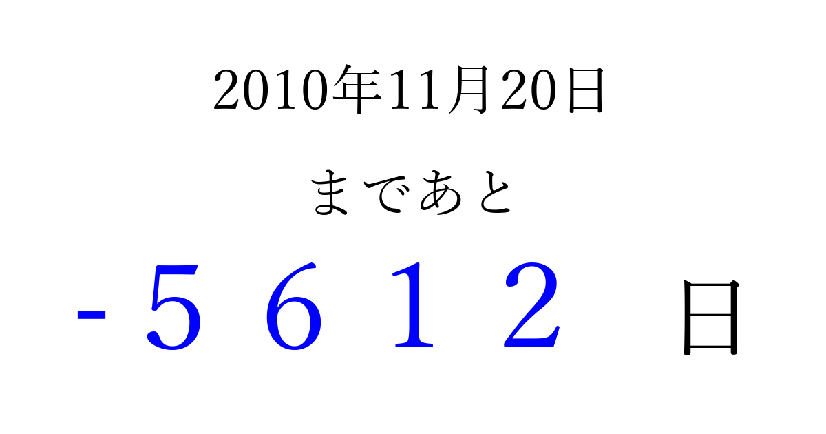 2010年11月20日(土)は もう 0000 日過ぎました 追加すると、トップページからすぐ選べるようになります ※2026/04/02現在の結果です。 最新の状態に更新する ↓シェアして、タイムライン上にカウントダウンを表示しよう!↓ 📤 この結果を共有する Tweet シェア Threads Bluesky 別の日付でカウントダウン 2010年11月のカレンダー このページをブックマークに追加すると、いつでもカウントダウンを確認できます。 (PC: Ctrl+D / Mac: ⌘+D) hitome-notes.comでは以下のページも運営しています。 指定日と期間から日付を計算 | ガチャ確率計算・シミュレーション | プライバシー・ポリシー 運営者:Avocado