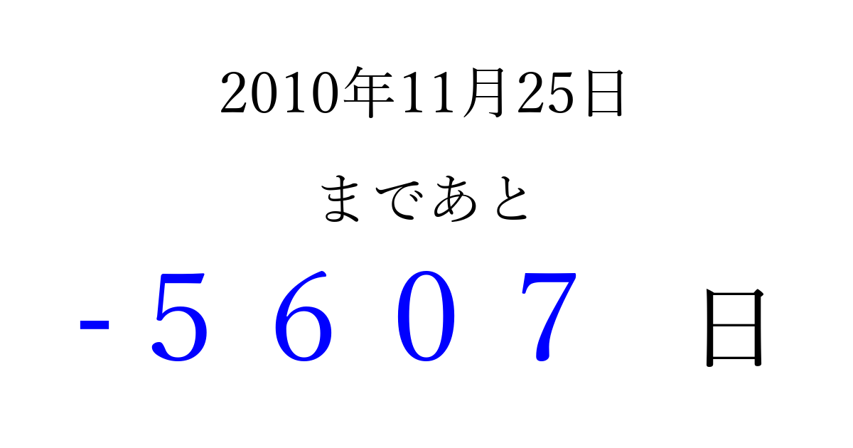 2010年11月25日(木)は もう 0000 日過ぎました 追加すると、トップページからすぐ選べるようになります ※2026/04/02現在の結果です。 最新の状態に更新する ↓シェアして、タイムライン上にカウントダウンを表示しよう!↓ 📤 この結果を共有する Tweet シェア Threads Bluesky 別の日付でカウントダウン 2010年11月のカレンダー このページをブックマークに追加すると、いつでもカウントダウンを確認できます。 (PC: Ctrl+D / Mac: ⌘+D) hitome-notes.comでは以下のページも運営しています。 指定日と期間から日付を計算 | ガチャ確率計算・シミュレーション | プライバシー・ポリシー 運営者:Avocado