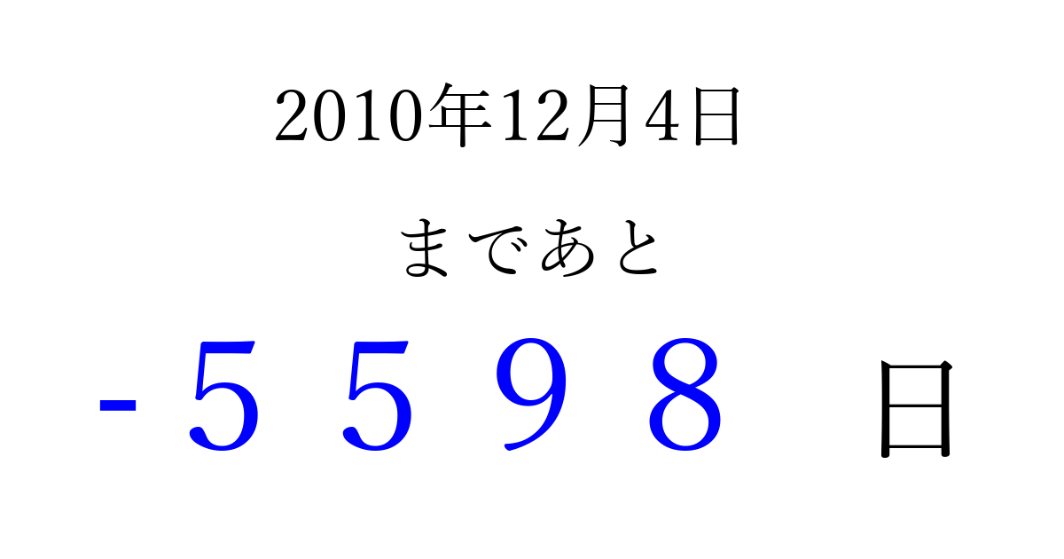 2010年12月4日(土)は もう 0000 日過ぎました 追加すると、トップページからすぐ選べるようになります ※2026/04/02現在の結果です。 最新の状態に更新する ↓シェアして、タイムライン上にカウントダウンを表示しよう!↓ 📤 この結果を共有する Tweet シェア Threads Bluesky 別の日付でカウントダウン 2010年12月のカレンダー このページをブックマークに追加すると、いつでもカウントダウンを確認できます。 (PC: Ctrl+D / Mac: ⌘+D) hitome-notes.comでは以下のページも運営しています。 指定日と期間から日付を計算 | ガチャ確率計算・シミュレーション | プライバシー・ポリシー 運営者:Avocado