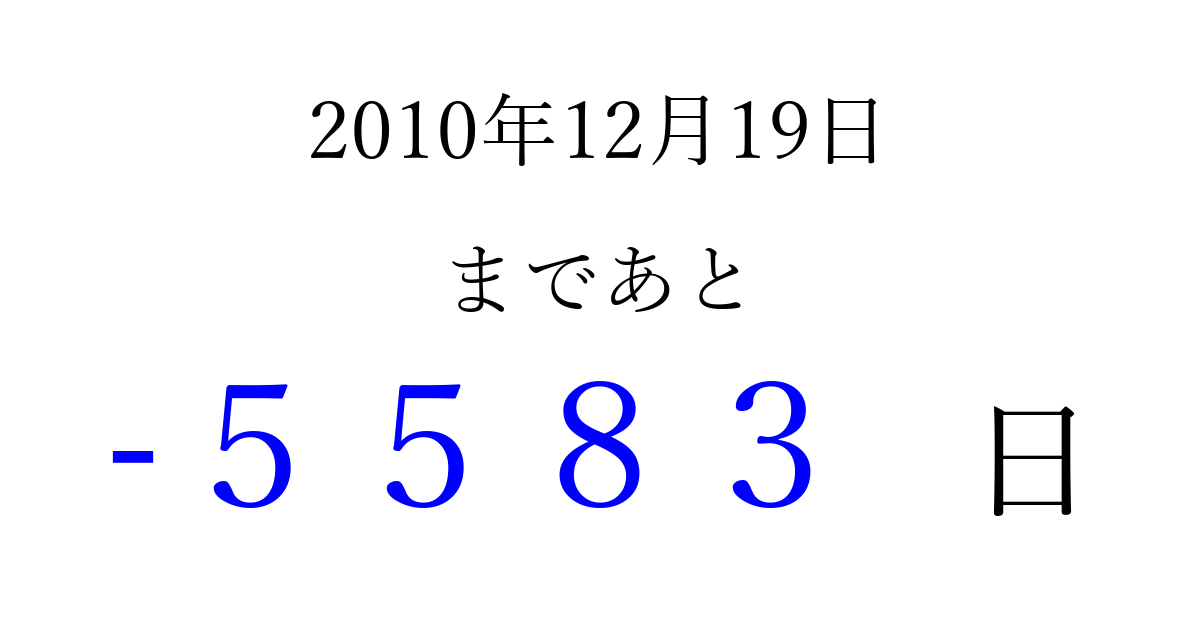 2010年12月19日(日)は もう 0000 日過ぎました 追加すると、トップページからすぐ選べるようになります ※2026/04/02現在の結果です。 最新の状態に更新する ↓シェアして、タイムライン上にカウントダウンを表示しよう!↓ 📤 この結果を共有する Tweet シェア Threads Bluesky 別の日付でカウントダウン 2010年12月のカレンダー このページをブックマークに追加すると、いつでもカウントダウンを確認できます。 (PC: Ctrl+D / Mac: ⌘+D) hitome-notes.comでは以下のページも運営しています。 指定日と期間から日付を計算 | ガチャ確率計算・シミュレーション | プライバシー・ポリシー 運営者:Avocado