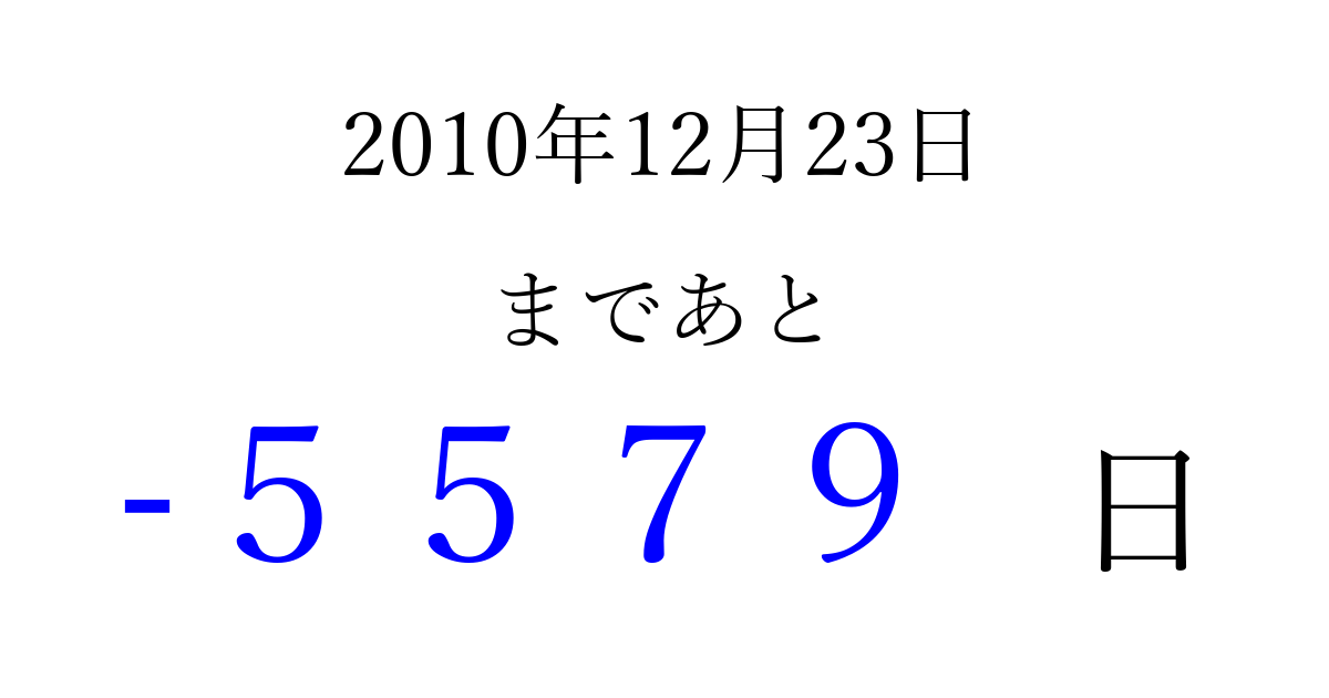 2010年12月23日(木)は もう 0000 日過ぎました 追加すると、トップページからすぐ選べるようになります ※2026/04/02現在の結果です。 最新の状態に更新する ↓シェアして、タイムライン上にカウントダウンを表示しよう!↓ 📤 この結果を共有する Tweet シェア Threads Bluesky 別の日付でカウントダウン 2010年12月のカレンダー このページをブックマークに追加すると、いつでもカウントダウンを確認できます。 (PC: Ctrl+D / Mac: ⌘+D) hitome-notes.comでは以下のページも運営しています。 指定日と期間から日付を計算 | ガチャ確率計算・シミュレーション | プライバシー・ポリシー 運営者:Avocado