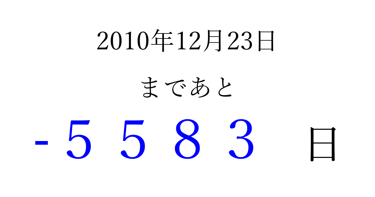 2010年12月23日(木)は もう 0000 日過ぎました 追加すると、トップページからすぐ選べるようになります ※2026/04/06現在の結果です。 最新の状態に更新する ↓シェアして、タイムライン上にカウントダウンを表示しよう!↓ 📤 この結果を共有する Tweet シェア Threads Bluesky 別の日付でカウントダウン 2010年12月のカレンダー このページをブックマークに追加すると、いつでもカウントダウンを確認できます。 (PC: Ctrl+D / Mac: ⌘+D) hitome-notes.comでは以下のページも運営しています。 指定日と期間から日付を計算 | ガチャ確率計算・シミュレーション | プライバシー・ポリシー 運営者:Avocado