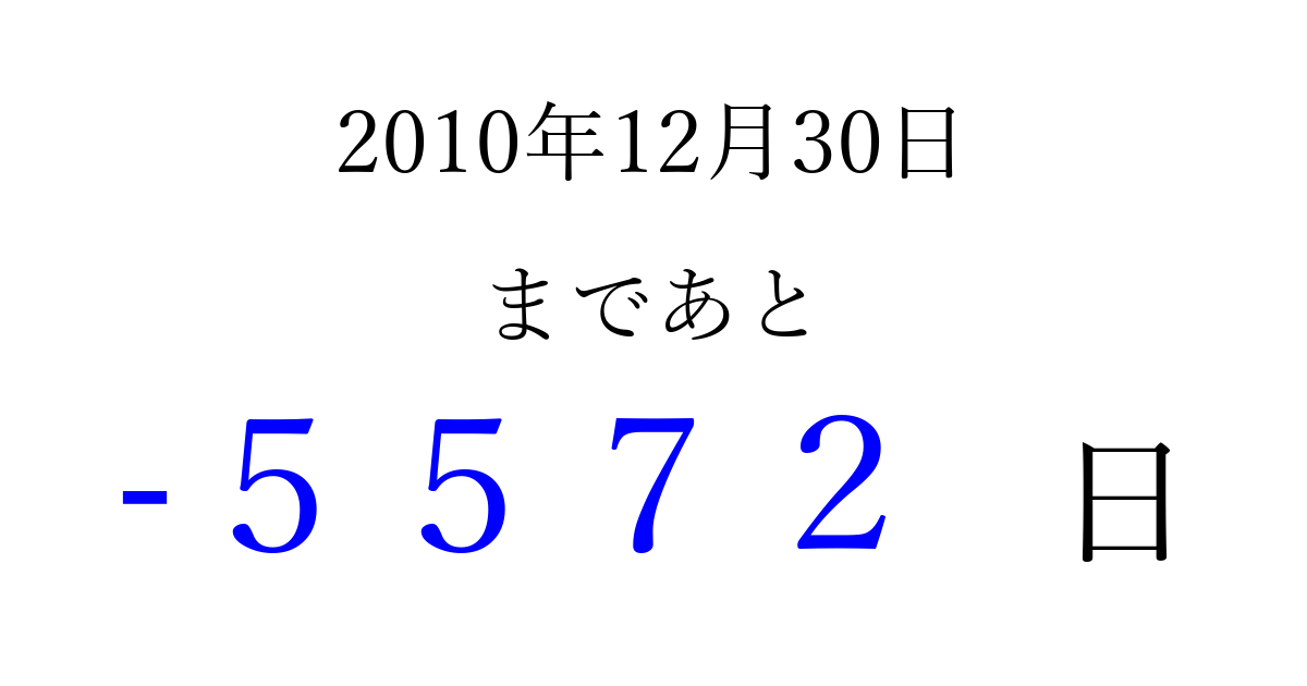 2010年12月30日(木)は もう 0000 日過ぎました 追加すると、トップページからすぐ選べるようになります ※2026/04/02現在の結果です。 最新の状態に更新する ↓シェアして、タイムライン上にカウントダウンを表示しよう!↓ 📤 この結果を共有する Tweet シェア Threads Bluesky 別の日付でカウントダウン 2010年12月のカレンダー このページをブックマークに追加すると、いつでもカウントダウンを確認できます。 (PC: Ctrl+D / Mac: ⌘+D) hitome-notes.comでは以下のページも運営しています。 指定日と期間から日付を計算 | ガチャ確率計算・シミュレーション | プライバシー・ポリシー 運営者:Avocado